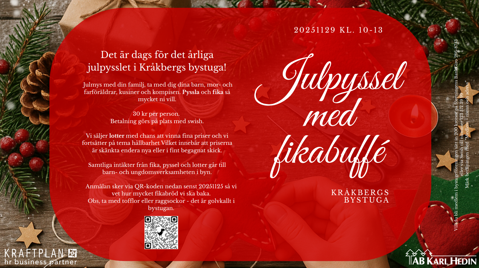 Julpysslet kostar 30kr per pysslare/fikare och betalas med Swish på plats.