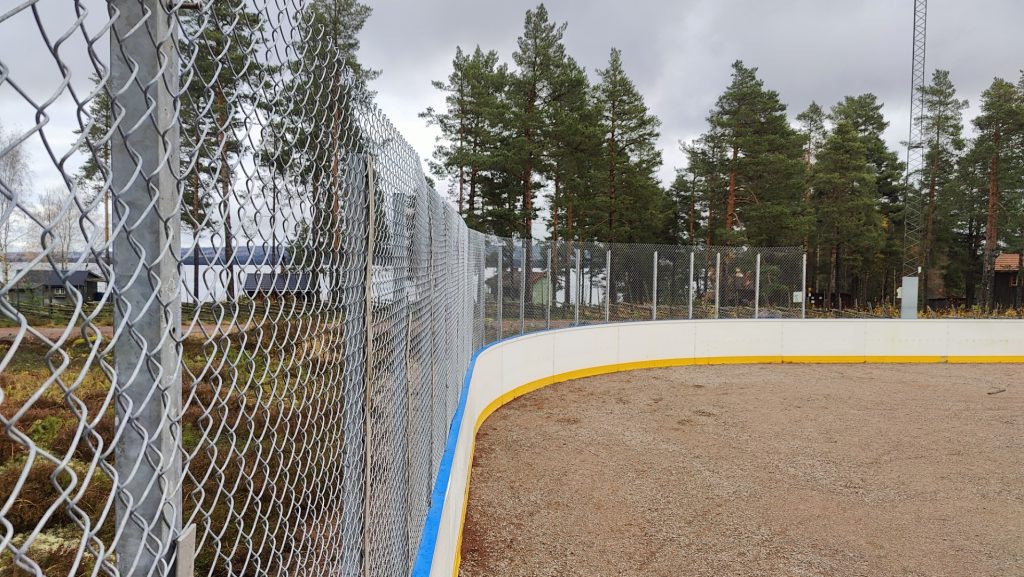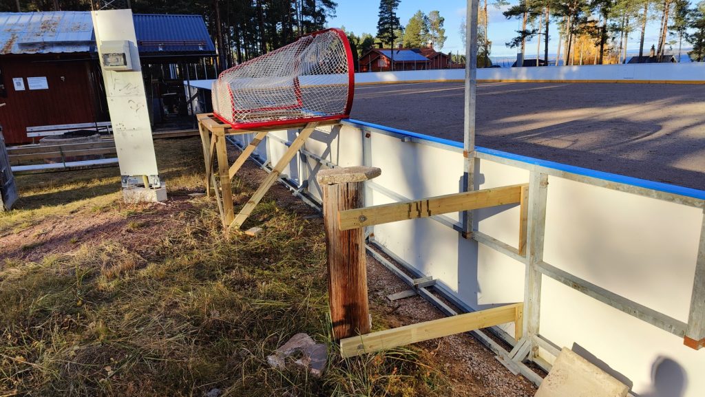 Resning och montering av nya sarg sektioner. Stöttor, förankring av sektioner samt hållare för målburar. Montering av stolpar samt nytt skyddsstängsel.